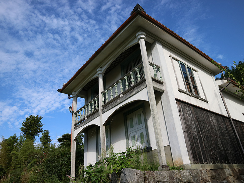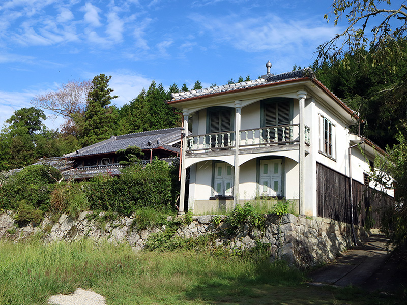 この洋館は秋景楼といい、1885(明治18)年、地元の大庄屋・奥野佶次が屋敷の離れとして建てた木造2階建て。白壁にベランダを備えた趣深いたたずまい。