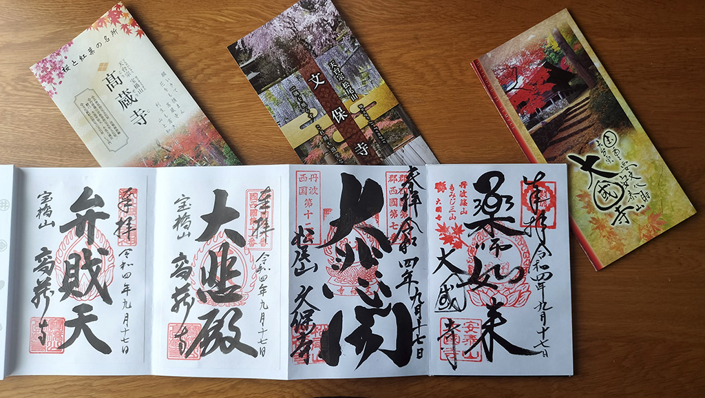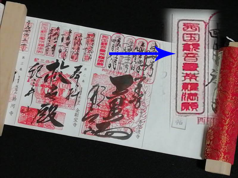 先達においては、この「西国観音曼荼羅」満願にて上位先達への昇補のための一巡とすることができます。ということで松尾寺で八角納経札に御朱印をいただくと共に満願を確認していただき、軸装納経帳の全寺の五巡目に「西国観音曼荼羅満願」印を押印していただきました。