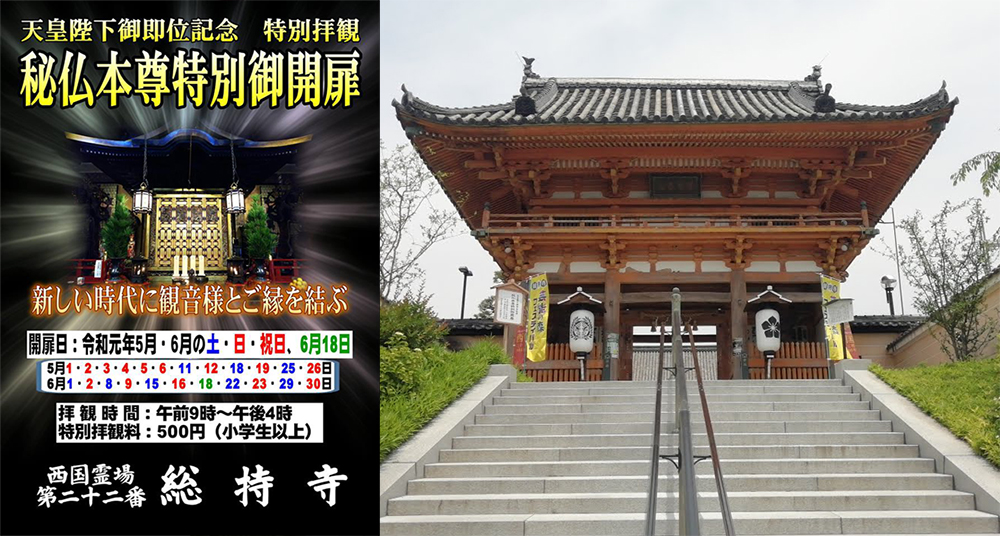 新しい納経軸が届く前から届いたら行こうと思っていたのが二十二番札所の総持寺です。なぜ総持寺かというと・・・理由は二つあります。まず一つは、大先達昇補で新たにいただける「西国観音曼荼羅」を受け取れる先達委員会札所であること。そして天皇陛下御即位・令和改元記念「秘仏本尊特別御開扉」が行われているからです。