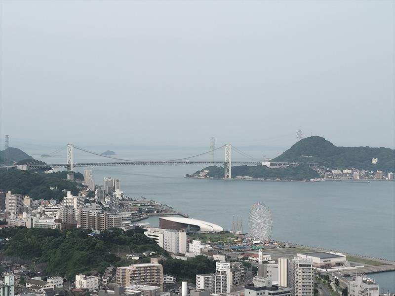 関門連絡船の所要時間は5分ほど。海峡や関門橋を眺めてるとあっという間に到着。本日の最後はキラキラ輝くクリスタルの様に、朝・昼・夜、刻々と変わる海峡の風景を映しながら、遥か天空をめざしそびえる全長153mの「海峡ゆめタワー」。地上143mの最上階展望室から眺める景色は最高だった。(快晴だったらもっと素晴らしかっただろうな~。)