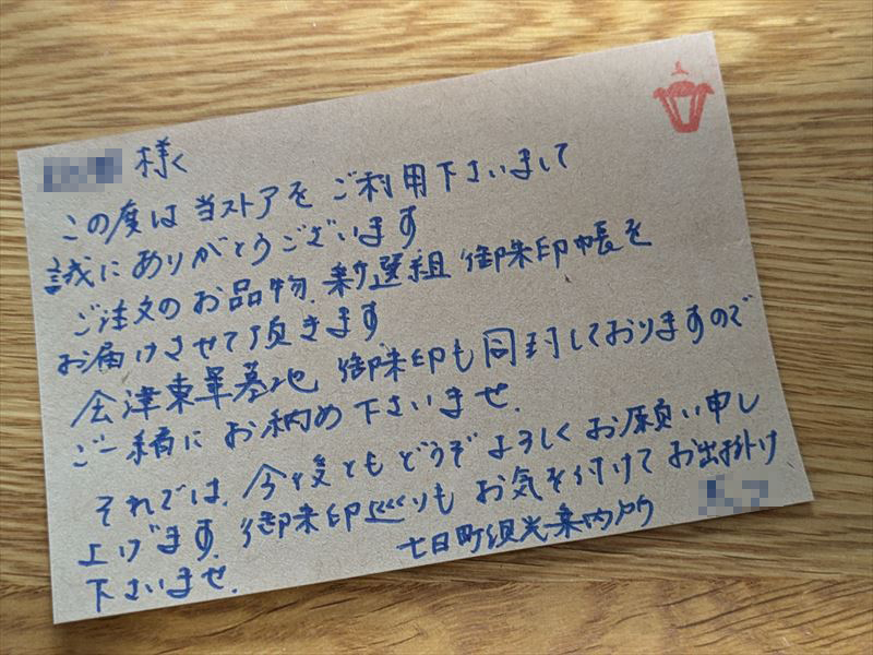 ポチってから数日、商品が届きました。すごく丁寧なお礼状も一緒に入ってました。こんなのが入ってるとうれしいですよね。買ってよかった~って思っちゃいます。会津東軍墓地の御朱印も付けていただきました。(ちゃんと日付も入れてありました。)