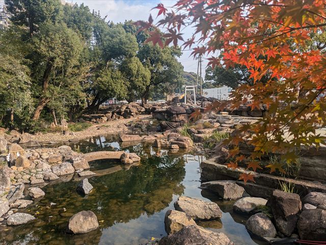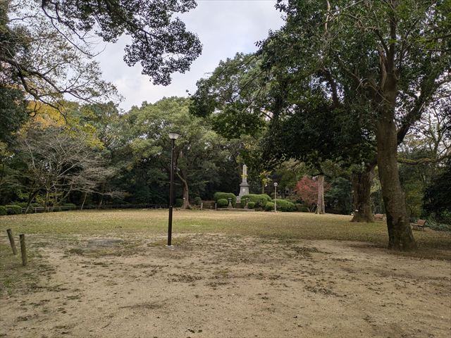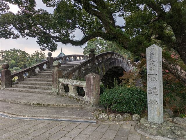 諫早城跡を中心に整備された諫早公園に到着。まず目に入ってくるのが公園近くを流れる本明川に架けられていた眼鏡橋(国の重要文化財)だ。1960年(昭和35年)園内の池に移築されてたとのこと。また公園内の城山(標高50m)の樹叢は、諫早市城山暖地性樹叢の名称で国の天然記念物に指定されている。