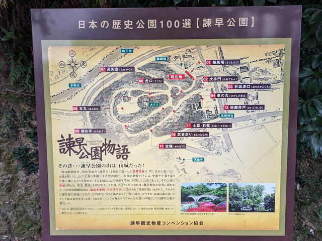 諫早城は西郷尚善によって築かれた城です。西郷純堯の代に、豊臣秀吉が発令した九州征伐に従わず所領を没収され、諫早の地は龍造寺家晴に与えられました。家晴の子・直孝は名を諫早氏に改め、以降幕末まで龍造寺四家のひとつとしてつづきました。諫早氏は代々諫早城を居城として維持していましたが、5代・茂門のときに財政難によって城が維持できなくなったため、東麓に諫早陣屋を構え廃城となりました。(攻城団ホームページより抜粋)