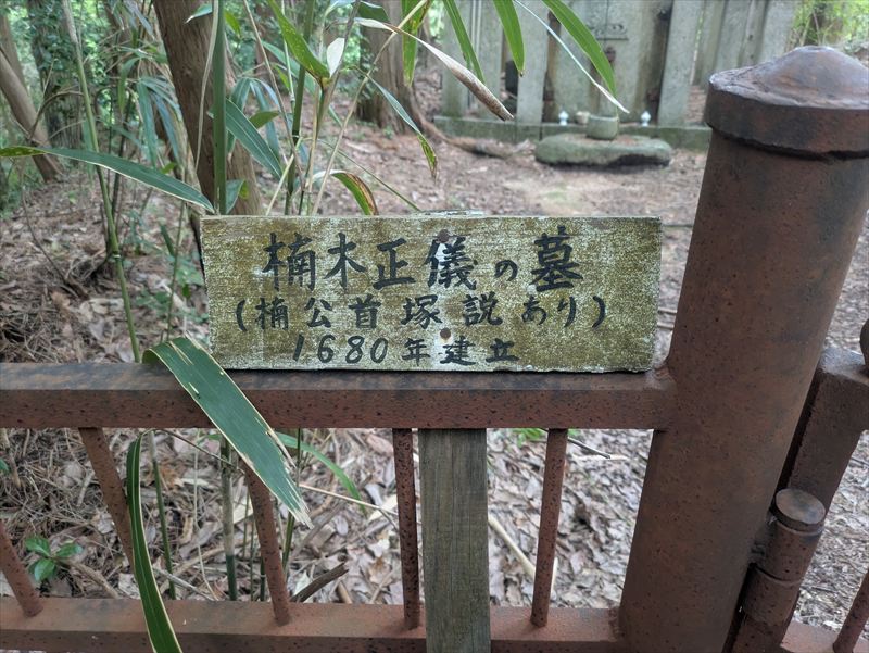 正成は湊川の戦いで戦死し、首は京都に送られたとも、仲間が持ち帰ってこの地に葬ったともいわれています。真偽のほどは定かではありませんが、この場所が楠木一族と深く関わる“聖地”であることに疑いはありません。