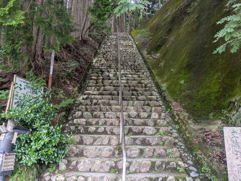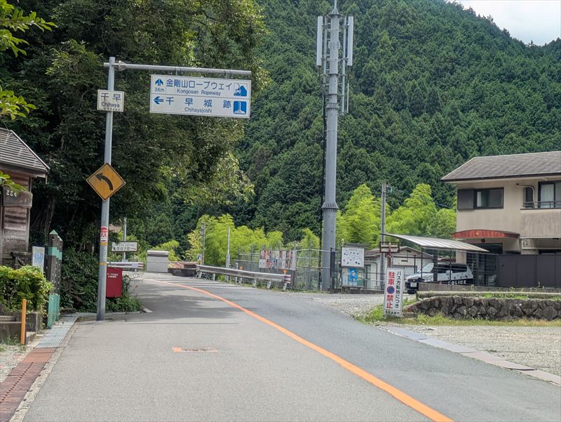 登城口は、金剛山登山口バス停すぐ、派出所前の登城口から。ここからいよいよ千早城への攻城が始まります。長い石段(約560段あるそうです)を登るごとに、楠木軍がこの山を守り抜いた激闘の跡が、空気ににじんでいるように感じます。