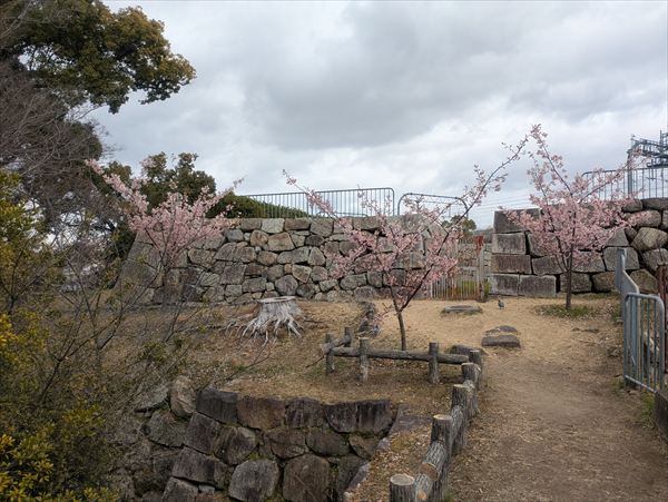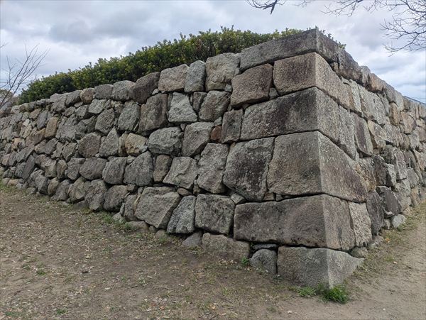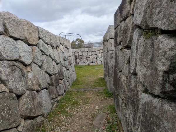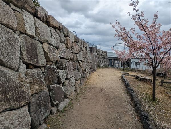 城跡に残る石垣や堀を眺めながら歩いていると、